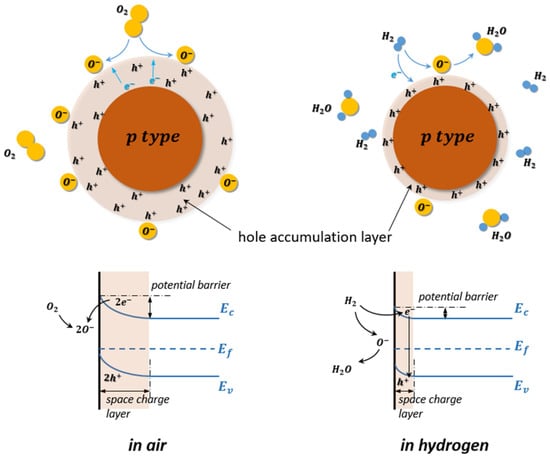 Meanwhile, the interaction between the MOS sensing materials and the surrounding chemical environment also affects the mobile carrier density inside metal oxide materials and changes their resistance consequently. In their gas sensing mechanisms, depending on the target gas (oxidizing or reducing) and semiconductor type (n- or p-type), the resistance can increase or decrease during the interaction with the target gas. In the case of n-type metal oxides with electrons (e-) as majority carriers, the resistance increases in oxidizing gases (acceptor) but decreases in reducing ones (donor), whereas the p-type metal oxide (e.g., NiO []) with holes as majority charge carriers has the converse resistance changes [].