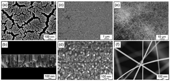 Many researchers have attached significance to Pd- and its composites-based nanowires and nanoparticles [,,,,,,,,,,,,,,,,,,,,,,,,,,,,,]. These materials have unique physical and chemical properties. Compared to the thin sensing films, these nanowires and nanoparticles have a larger surface–volume ratio, more enhanced sensitivity, lower power consumption, faster sensing response and better durability. The ratio of length to diameter is defined as the aspect ratio. The nanostructures with aspect ratios less than 10 are called nanorods (NRs), the aspect ratios more than 10 are called nanowires (NWs), and additionally, hollow NWs are called nanotubes (NTs).