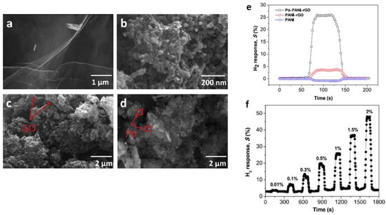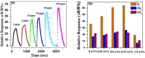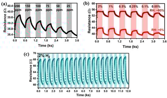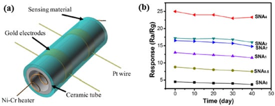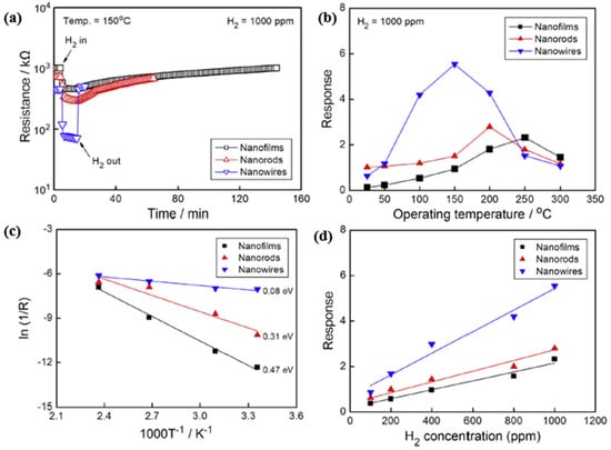 Therefore, future research and developments of very accurate and fast hydrogen sensors will play a crucial role in hydrogen safety. Studies in [,] proposed several criteria in consideration of hydrogen sensors, including response time, detection range, signal accuracy, recovery time, low cost and low power consumption, sensitivity to the environment, and so on. Regarding the efficiency of hydrogen leak detection, the gas response was mainly defined as the ratio of the electrical resistance variation in detection gas (Rg) to that in the air (Ra):