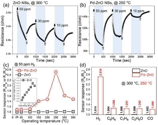 Even though Pd NPs can be deposited in hydrogen gas sensors as catalysts in hydrogen detection, their combination with metal oxide structures can still improve the sensing response by enhancing the electron conductive path. Much literature has discussed the use of Pd NPs decorated with various metal oxide structures for hydrogen gas sensing, such as ZnO [], SnO2 [,], WO3 [,], MnO2 [], and MoS2 [].