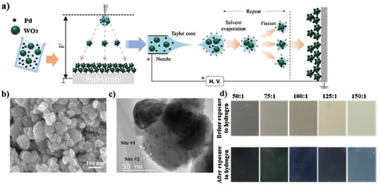 - Lee, J.; Koo, H.; Kim, S.Y.; Kim, S.J.; Lee, W. Electrostatic spray deposition of chemochromic WO3-Pd sensor for hydrogen leakage detection at room temperature. Sens. Actuators B Chem. 2021, 327, 128930. [Google Scholar] [CrossRef]