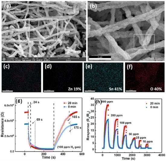 - Lee, J.H.; Kim, J.Y.; Kim, J.H.; Kim, S.S. Enhanced hydrogen detection in ppb-level by electrospun SnO2-loaded ZnO nanofibers. Sensors 2019, 19, 726. [Google Scholar] [CrossRef] [PubMed] [Green Version]