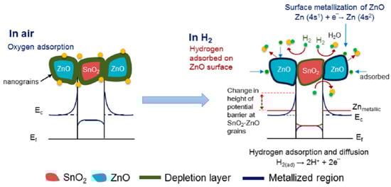 Another classification of promising materials for gas sensing is the conductometric metal oxide semiconductor (MOS). They are generally crystalline or polycrystalline in nature and interconnected with different grains having grain boundaries. However, by contrast with transition metals, most metal oxide materials are essentially insulators at room temperature. As a result, they cannot be used directly for gas sensing due to their bandgaps between the conduction band and valence bands forming electron mobility barriers. Typically, the gas sensing suitable metal oxides have bandgap between 2.7 eV and 4 eV, like SnO2 (3.6 eV), NiO (3.5 eV), TiO2 (3.2 eV), ZnO (3.2 eV), WO3(2.7 eV) etc. [,]. With an elevated temperature in the range of up to 600 °C [], the amount of mobile electrons can be generated by electrons thermally from the valance band into the conduction band participating in the charge transfer.