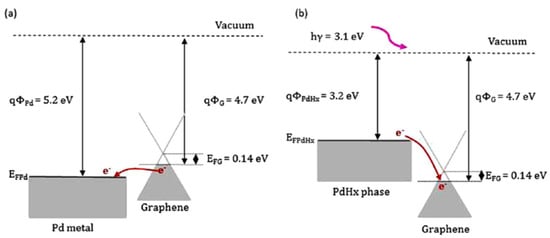 Palladium has been one of the most promising materials for gas sensing for decades. Due to its high hydrogen affinity and catalytic properties, Pd has been widely used as thin films or nanoparticles for hydrogen leak detection or hydrogen storage. This absorption process leads to lattice/volume expansion and resistance increase during hydrogen diffusion [,]. Moreover, Pd’s high state density at the Fermi level makes hydrogen absorption occur even at room temperature reversibly [].