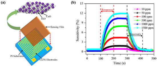 - Zhang, D.Z.; Yin, N.L.; Jiang, C.X.; Xia, B.K. Characterization of CuO–reduced graphene oxide sandwiched nanostructure and its hydrogen sensing characteristics. J. Mater. Sci. Mater. Electron. 2017, 28, 2763–2768. [Google Scholar] [CrossRef]