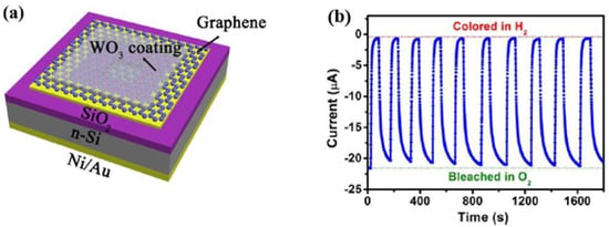 - Chen, M.Y.; Zou, L.P.; Zhang, Z.H.; Shen, J.; Li, D.; Zong, Q.J.; Gao, G.H.; Wu, G.M.; Shen, J.; Zhang, Z.X. Tandem gasochromic-Pd-WO3/graphene/Si device for room-temperature high-performance optoelectronic hydrogen sensors. Carbon 2018, 130, 281–287. [Google Scholar] [CrossRef]