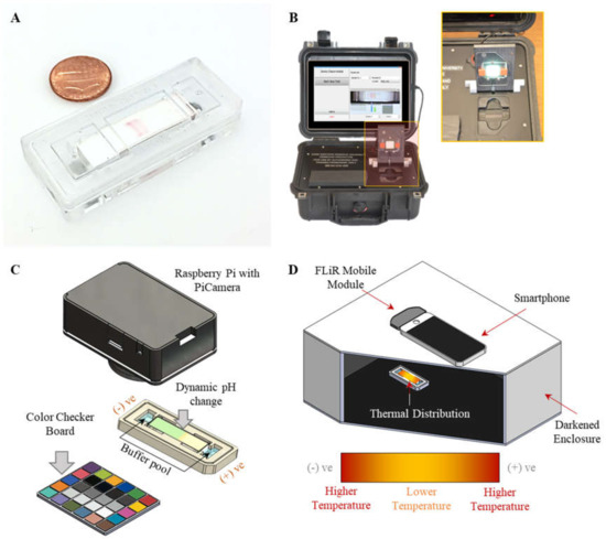 CA paper was purchased from VWR (Radnor, PA, USA). The electrophoresis buffer, Tris/Borate/EDTA (TBE) 10×, and the ultrapure water were purchased from ThermoFisher Scientific (Waltham, MA, USA). Universal pH indicator (UPI) was purchased from Sigma-Aldrich (St. Louis, MO, USA). Standard pH solution (colorless) with pH values of 5.0, 5.5, 6.0, 6.86, 7.0, 8.0, and 10.0 were purchased from Fisher Scientific (Hampton, NH, USA) and the standard pH solution with pH values of 8.0 and 9.0 were purchased from Thomas Scientific (Swedesboro, NJ, USA). Raspberry Pi (RPi) 3B+ camera was purchased from MicroCenter (Cleveland, OH, USA). Micro color checkerboard (ColorGauge Micro, Matte) was purchased from Edmund Optics (Barrington, NJ, USA). Handheld smartphone interfaced infrared camera (FLiR One) and infrared image analysis software were purchased from FLiR Systems (Wilsonville, OR, USA). K-type thermocouple (bead-probe, −200 °C~750 °C) and the 1/4 DIN Temperature/Process Controllers (used as a thermocouple reader, resolution 0.1 °C) were purchased from Omega Engineering (Norwalk, CT, USA). Silicone-based thermal interface material (TIM) was purchased from Grainger Industrial Supply (Brooklyn Heights, OH, USA).