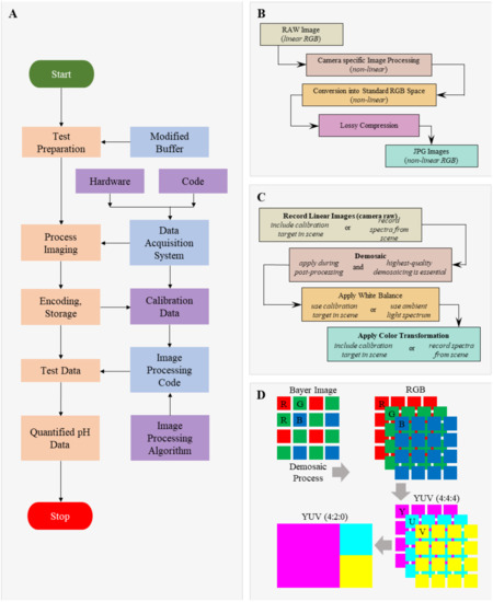 Flow-chart of data analysis for pH measurement. (A) Process flow-chart. (B) Image-processing algorithm for lossy compression. (C) Image-processing algorithm for loss-less processing. (D) Conversion of sensor data into YUV420 planar data format. This uncompressed linear format prevents any loss of data required for the image analysis.