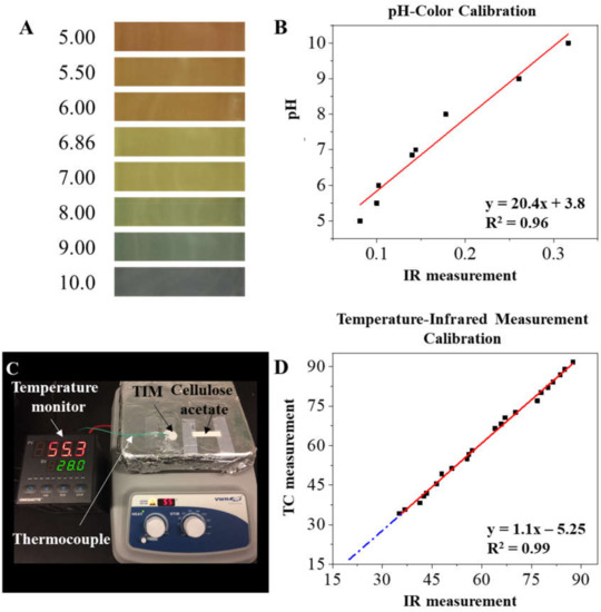 Calibration of pH and temperature-monitoring systems. (A) Images of the calibration system for monitoring pH change: CA paper with buffer containing pH indicator at given pH values (pH = 5 to pH = 10) were imaged. These imaged data were used to create the pH calibration curve demonstrated in (B). (C) Image of calibration system for temperature-change monitoring: CA paper is heated on the hot plate and the infrared temperature measurement is performed using images captured by the FLiR Studio software. The actual temperature is measured from the reading of a thermocouple (K-type) mounted to the hot plate. Infrared temperature measurements are calibrated to the thermocouple temperature measurements (D).