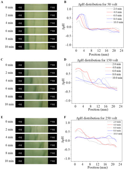 Spatial pH distribution at 0, 2, 4, 6, 8, and 10 min under different electric fields. (A,B) Time-lapse images and pH distribution on CA paper under 1667 V/m (50 V). (C,D) Time-lapse images and pH distribution on CA paper under 5000 V/m (150 V). (E,F) Time-lapse images and pH distribution on CA paper under 8333 V/m (250 V).