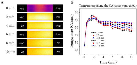 In the paper-based microchip electrophoresis system, the temperature change was associated with: (1) joule heating generated from the electric current passing through the buffer soaked CA paper [15,16]; (2) electrochemical reactions related to heat consumption (endothermic water electrolysis reaction) [16]; (3) heat dissipation induced by water phase change (vaporization) [31,32]; and (4) passive heat dissipation by conduction/diffusion [31,32]. The initial temperature raises between 0–120 s were mainly attributed to joule heating induced by the conductive buffer solution and applied electric field. The decrease in temperature temporally from 120–600 s (Figure 5B) was probably due to: (a) the elevated magnitude of heat diffusion induced by the high temperature gradient (~41 °C from CA paper to room temperature of 25 °C); and (b) the reduced rate of heat generation by joule heating due to the reduction in electric current. This reduction in electric current is probably due to the stabilization of the electrochemical system, as described previously in other systems [33]. With time, the system reached a quasi-equilibrium state where the total generated heat was in balance with the heat dissipated by the system.