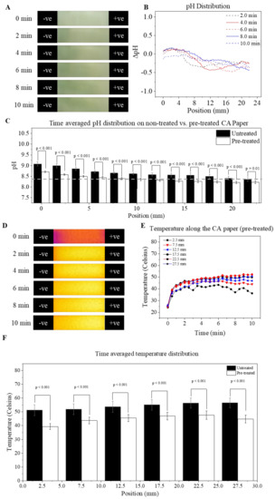 Thermal mapping of the pre-treated CA paper. (A) time-lapse of a HemeChip test run at 83.33 V/cm with a pre-treated CA paper, (B) pH distribution of a HemeChip test run at 8333 V/m with a pre-treated CA paper, (C) time-averaged pH distribution comparison between a treated and non-treated CA paper, (D) temperature distribution of a HemeChip test run at 83.33 V/cm with a pre-treated CA paper, (E) yaxis-averaged temperature distribution along the x-axis of a pre-treated CA paper, and (F) time averaged temperature distribution comparison between an untreated and a pre-treated CA paper.