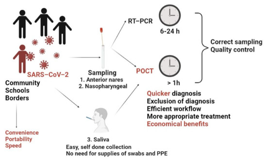 Consistent efforts have been concentrated on designing and manufacturing simple, rapid, accurate and affordable diagnostic kits to be used at home by anyone. Despite these efforts, the lack of diagnostic resources, human and technological, slowed down the progress and affected the outcomes of the protocols in place aimed at controlling the SARS-CoV-2 pandemic. Several technology-related aspects need to be considered when evaluating the situation for further improvements. For instance, it is known that most of the tests are portable benchtop analysers or even smaller handheld devices (i.e., MicrosensDx, RapiPrepCOVID-19, MesaBioTech Accula Test). However, all of these require sample preparation, which involves technical skills for viral transport media, pipetting, refrigeration and temperature re-equilibration. Moreover, limited access to reagents and equipment slows down the detection rate and hinders efforts to mitigate viral spread. The result is the relatively low throughput that imposes multiple processing units and dependence on the clinical setting for centralised testing. In the meantime, the clinical component is related to the immunological response, which takes time to be identified (the organism did not start developing antibodies against the virus) and varies from one patient to another (in some patients, the immune response is weak with untraceable antibodies), making the infection undetectable [11]. The clinical aspects, indeed, add to the technical difficulties. For example, one study [12] discussed the value of anosmia as a marker in mild cases excluded from testing. Furthermore, the study highlighted that the newly developed and persistent anosmia resulting from COVID-19 does not reflect these individuals’ infectious levels or the moment they have viral clearance. Other data also urged caution about smell tests as a screening tool in some settings, such as airports and shopping centres [13,14], despite the high positive predicting clinical value of new-onset and sudden-onset anosmia when the disease’s prevalence is high. Moreover, it is essential to consider that, if the virus mutates in the reverse transcription polymerase chain reaction (RT-PCR) target region, SARS-CoV-2 may not be detected or detected less predictably. Therefore, the performance characteristics of a test and its limitations in relationship with the epidemiology of the disease are imperative to avoid false-negatives (in case of high disease prevalence, inhibitors or medication interferences) and false-positives (when prevalence is moderate to low). The ideal combination is yet to emerge, as each test has its strengths and limitations. For instance, STOP (SHERLOCK Testing in One Pot) COVID [15] could be a valid aid in the “test-trace-isolate” type of test, especially in low-resource settings. However, the low throughput and the poor sensitivity of lateral flow-based systems at the early stages of SARS-CoV-2 infection hinder their use as POC molecular tests [16]. Similarly, 2020 data highlighted that the lateral flow devices for asymptomatic mass testing proved controversial due to their incapacity to detect the actual infection [17]. In the case of clustered regularly interspaced short palindromic repeats (CRISPR) [18], the major disadvantage is the lack of automation with manually operated protocols that increase sample contamination risk, despite being a highly reliable, specific and sensitive detection method [19]. The inability to test many patients resided initially in the limited biological specimens collected from suspect subjects. Currently, SARS-CoV-2 nucleic acid is generally detectable in saliva specimens during the acute phase of infection [20]. Therefore, the screening will continue to be evaluated and perfected as POCT in conjunction with patient history as well as clinical and other diagnostic information necessary to determine patients’ infection status. Also, information about the contaminated environment could be a significant element of the surveillance system during the COVID-19 pandemic. It has been observed that Ribonucleic acid (RNA) virus [21,22,23] is spilt in wastewater [24]. Therefore, standardised protocols are required for timely and accurate quantification of viral loads and a straightforward correlation with the community infection levels [25] and surveillance [26]. Also, detecting viral variants in wastewater could provide valuable information about the natural progress of viral epidemics and the-related contingency plan. Further work will improve the technology and results to increase the potential of existing methods as efficient detection and monitoring approaches.