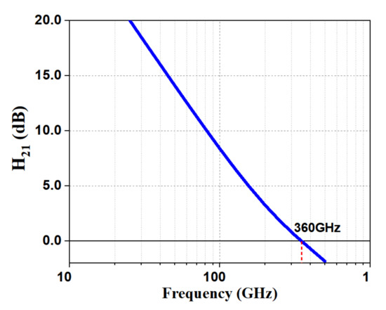 A typical bias current of 0.8 mA/µm at a collector–emitter voltage of 1.2 V was initially chosen as a trade-off between maximum available gain () and minimum noise figure (). The and for inductively emitter degenerated HBT’s over frequency versus emitter length () is shown in Figure 7.