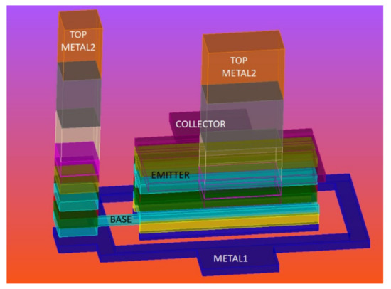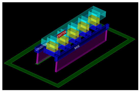 The 3D structure of the heterojunction bipolar transistor (HBT) transistor.