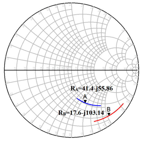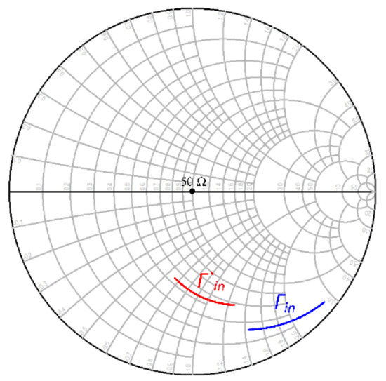As mentioned earlier, input matching was essentially addressed by the series-resonant DC block MIM capacitor, the series transmission line, and the shunt 96 Ω transmission line used for biasing the base, as the transistor sizing and inductive emitter degeneration were already selected to move the input matching close to 50 Ω. The smith chart of the input matching network is shown in Figure 10a. The input impedance of the circuit is given by Equation (4) [13,14].