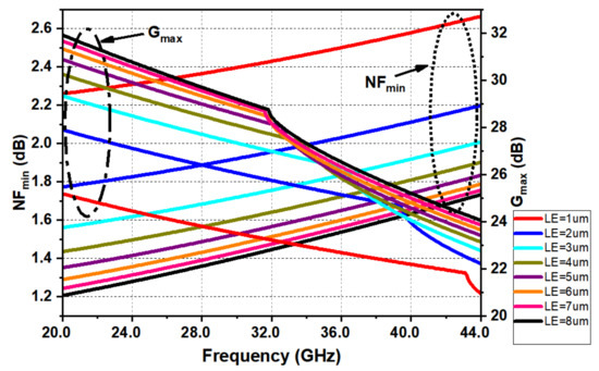 - Antonopoulos, A.; Papathanasiou, K.; Bucher, M.; Papathanasiou, K. CMOS LNA design at 30 GHz—A case study. In Proceedings of the 2012 8th International Caribbean Conference on Devices, Circuits and Systems (ICCDCS)., Playa del Carmen, Mexico, 14–17 March 2012; pp. 1–4. [Google Scholar]