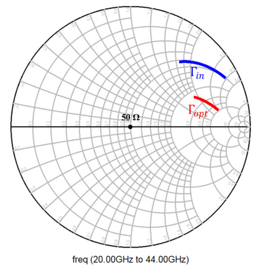 To achieve this, the transistor current density was kept constant, and the emitter length (LE) of the transistor was varied to ascertain a point for which the real part of the impedance was 50 Ω for optimum noise performance. Figure 8 shows the optimal noise impedance in terms of optimal reflection coefficient for the chosen emitter length of 5 μm, which corresponded to a collector current of 4 mA.