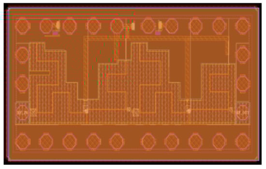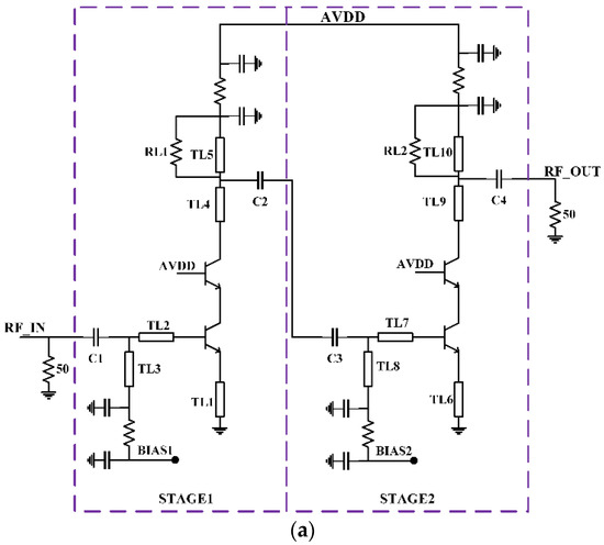 Equations (4)–(6), provide elements to design the input-matching circuit, which is again improved by simulation of the parameter. The first stage output and second stage input were matched by incorporating interstage matching. Initially, the output impedance (Zout1) of the first stage and input impedance (Zin2) of the second stage were determined. Complex conjugate matching (Zout1* = Zin2) was incorporated between first-stage output and second-stage input [15,16]. This kind of interstage matching helped to reduce losses between the interstage and thus preserved the signal properties.