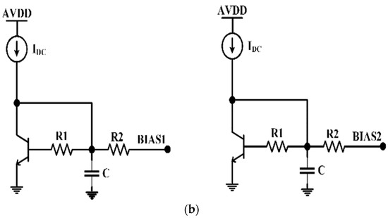 Low power continues to be one of the primary objectives in LNA design. The ease of cascode configuration enables low-power LNAs to be employed. The presented LNA accomplishes an inductively degenerated cascode common-emitter (CE) circuit arrangement, as shown in Figure 9a. The biasing circuit used is shown in Figure 9b. Two amplification stages were incorporated in the designed LNA to realize the dynamic range with a high gain and low noise. Cascoding transistors Q1/Q2 (and Q3/Q4) were employed to impact the isolation between input and output and to minimize the effect of the parasitic base-collector capacitance of Q1/Q2 (and Q3/Q4).