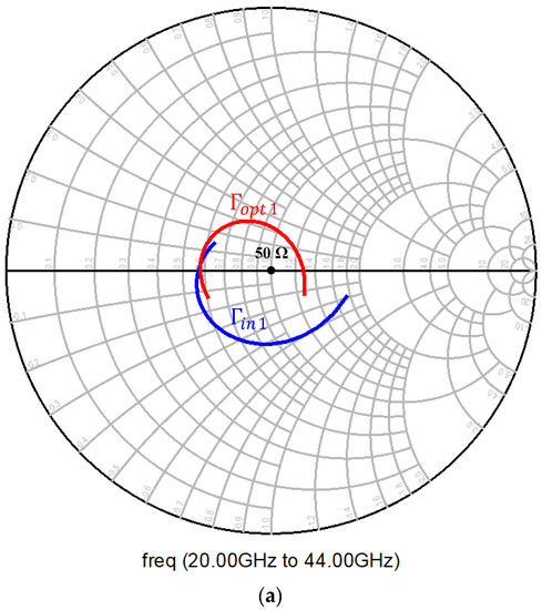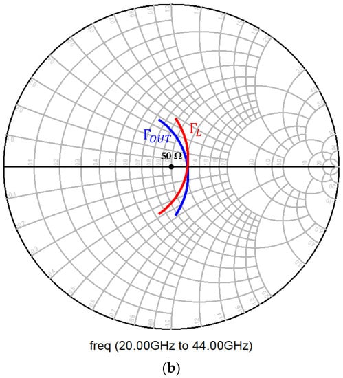 Smith chart of (a) input-matching network and (b) output-matching network over a frequency of 20–44 GHz.