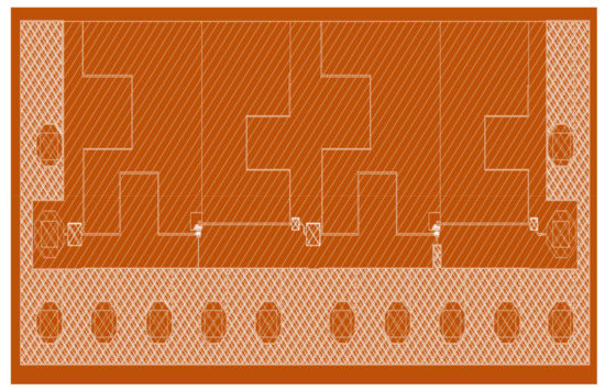 Similarly, the second-stage input-matching elements were formed by the transmission lines TL6, TL7 and TL8 and a series MIM capacitor, whereas the output-matching elements were formed by the transmission line TL9 and TL10 and a series DC blocking capacitor. All transmission lines were realized as microstrip lines, with the top metal layer (Top Metal 2) being the signal line, and the bottom metal layer (Metal 1) being the RF ground.