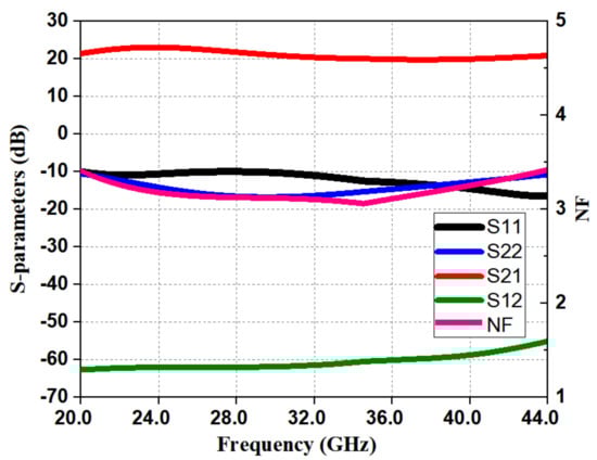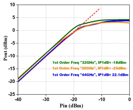 The characteristics of the LNA were validated by simulating two-port S-parameters from a frequency of 20–44 GHz. The simulated input reflection coefficient () and output reflection coefficient () are shown in Figure 13. and of <−10 dB were achieved from a frequency of 20–44 GHz with a 50 Ω source and load impedance. The simulated NF (Noise Figure) is as shown in Figure 13, and IP1dB (input 1 dB gain compression point) [17,18] is shown in Figure 14; they were 3.42 dB and −18 dBm, respectively. In Figure 13, the simulated gain appears greater than 20 dB from 20–44 GHz. The reverse isolation () of the presented LNA was < −65 dB, as shown in Figure 13.