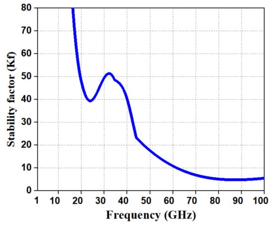 In order to validate the stability of the LNA, a stability analysis was performed across a frequency range of 10–60 GHz. For unconditional stability, the stability factor () should be greater than 1 [19,20]. The proposed LNA was unconditionally stable in the frequency range of 10–60 GHz, which is way beyond the operating frequency range of LNAs, and its stability factor () was as shown in Figure 15.