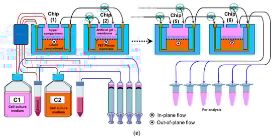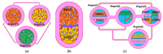 - Creating several simple microfluidic chambers/chips, within each, a cell monoculture is hosted, which is connected either through microchannels or tubing [5,6,7,8,9,10] (Figure 1a). This design enables an easy and simple connection of many organ modules using external channels/tubing with the possibility of selectively switching the flow into the individual chip (ON/OFF) or directing the flow using external fluidic valves. In addition, modules can be connected/disconnected at the desired time (e.g., after cell differentiation). However, the organization of cell types in this design does not mimic that in vivo, where the cell–cell interfacing distance (i.e., the channel/tubing) between the various types of cells is relatively large. This design is suitable to link cells/tissues, which are separated a distance between each other such as heart–liver, intestine–liver, etc., but do not provide a physiologically relevant cell–cell interfacing when used to model the heterogeneous cellular structure of an individual organ, such as the liver which contains several cell types (hepatocytes, hepatic stellate cells, sinusoidal endothelial cells, and Kupffer cells), or interfacing the parenchyma and nonparenchymal cells or immune cells where cells are very close to each other. Zhang et al., 2017 [11] reported an integrated modular sensing platform through a fluidics-routing breadboard, which operates multiorgan-on-a-chip units. The system comprises built-in pneumatic valves, micro bioreactors for housing organoids, and biochemical, physical, and optical sensors. The individual modules are selectively connected/disconnected with Teflon tubes. The system was tested for long-term monitoring of drug-induced organ toxicity in hepatic and cardiac organoids. Few commercial platforms became available. For example, TissUse GmbH (Berlin, Germany) introduced a variety of HUMIMIC Chips, such as HUMIMIC Chip2, HUMIMIC Chip3, HUMIMIC Chip4, and HUMIMIC Chip XX/XY, for different in vitro modeling purposes, which enable the integration of 2, 3, and 4 organs [12].