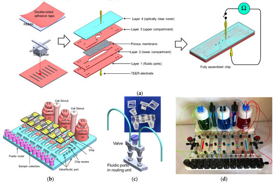 (a) Fabrication of the microfluidic chip. The chip was assembled of four PMMA sheets with microfluidic features created using the laser cutting technique. A porous membrane separates the two (upper and lower) microfluidic compartments. Gold electrodes with a diameter of 500 µm were inserted into the top and bottom cover to access the upper and lower compartment for TEER measurements. (b) 3D drawing of the perfusion system with its major components. (c) 3D-printed micro valve which was used to regulate the flow within the chip assembly (d) An image of the fully assembled perfusion system (colored liquid was used for better visualization). (e) The microfluidic chip assembly with an example of possible chip-chip connecting.