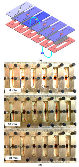 Fluidic routing through chip assembly. (a) Connection of the chip assembly, (b) images showing the color mixing due to the fluidic transfer through chips.
