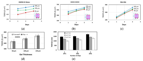 To characterize the integrated TEER electrodes, artificial membranes were built on top of the PET membrane, which were made of agarose gel with thicknesses of 50 µm, 100 µm, and 150 µm. TEER electrodes were inserted as shown in Figure 2a and the TEER values were recorded at different time intervals. Three different solutions within the upper/lower compartments were used: DMEM/DMEM, PBS/PBS, and DMEM/distilled water. The conductivities of DMEM, PBS, and DI water were 14 mS/cm, 17 mS/cm, and 0.0017 mS/cm, respectively. Higher TEER values were measured for the thicker, gel-coated membrane and a slight increase of the TEER was also observed with time (Figure 4). This can be attributed to the possible change of gel-coated membrane porosity and structure during the course of the experiment when it is suspended in the DMEM or PBS solutions. It should be noted that the agarose gel was used only to demonstrate the structure of the chip and chip assembly and several other materials can be used to construct the artificial membrane, such as the lipid mixture used in the artificial membrane permeability assay (PAMPA) [21,22].