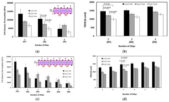(a) The permeability of FITC-dextran through 3 chips linked to each other in a series through the lower (basolateral) compartments. The permeability was detected by measuring the intensity of FITC in the upper compartments. S indicates the sample collected from the corresponding upper compartment. (b) The corresponding TEER values. (c) The permeability of FITC-dextran through 6 chips. (d) The corresponding TEER values. Student t-test was used for statistical analysis. p < 0.05 was considered significant.