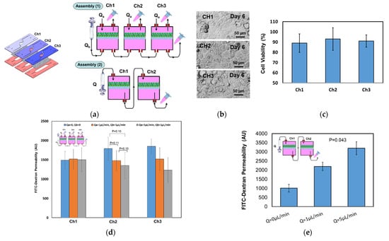 Fully confluent layers of caco-2 cells were created in a three-chip assembly (Figure 6a,b). The cell culture was maintained in the CO2 incubator and the cell growth was monitored regularly under a microscope. Figure 6b shows three bright field images taken at day 6 of cell culture from the apical compartments, and Figure 6c shows acceptable cell viability (> 89%) through the different chips. For testing the chip-to-chip communication, two different fluidic connections were utilized. In the first assembly (Assembly (1)), the lower compartments of the three chips were connected in a series, whereas the upper compartments were kept separated (Figure 6a). The second assembly (Assembly (2)) comprised two chips with the lower compartment of chip (1) connected to the upper compartment of chip 2 (Figure 6a). The two-chip assembly has only one inlet and one outlet. FITC-dextran solution was initially injected either in the first lower compartment of the assembly (1) or the first upper compartment of the assembly (2). Then, the infiltrates were collected from the upper compartments (Assembly (1)) and the lower compartment (Assembly (2)), and the fluorescent intensity (FI) was measured using a fluorescent plate reader. Figure 6d shows the FI, which is correlated to the permeability through the upper compartments of the three chips in static condition and at two different apical/basolateral flow rates (Qa = 1 µL/min, Qb = 1 µL/min, Qa = 5 µL/min, and Qb = 1 µL/min). The permeability slightly decreased when the basolateral flow rate increased, whereas the FI values within the three apical compartments were similar in the static condition. However, in the first chip, no change in the permeability was observed at different flow rates. This can be due to the location of the chip being close to the fluidic inlet, which leads to more markers flowing downstream toward the second and third chips due to the apical flow (Qa). In Assembly (2), all four compartments of the two chips were linked together and the liquid flowed in one direction through two membranes. The flow direction was from the apical to basolateral to mimic the direction of molecule transport (absorption through the small intestine). The FI increases with the flow rate as shown in Figure 6e, as the higher flow rate promotes more molecules to pass through the membrane. The upper compartments in the three chips shown in Figure 6 were identically seeded with caco-2 cells under the same conditions. In addition, TEER was monitored in individual chips in the three-chip assembly during the course of cell culture until a confluent layer was observed. TEER increased with time, as shown in Figure 6f, which indicates a successful cell culture within the chip assembly. This setup provides a tool for versatile experimental conditions to be exploited. For example, caco-2 monoculture can be studied in parallel and compared with a coculture of caco-2 cells and mucus-producing cells (goblet cells), or by adding artificial mucus to investigate the role of mucus in drug pharmacokinetics and as an immune component.