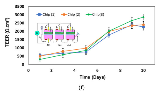 The TEER values across the artificial membrane were observed to be the highest when DMEM (upper) and DI water (lower) was used, due to the low conductivity of water compared to DMEM and PBS. On the other hand, TEER values were the lowest when PBS (upper) and PBS (lower) were used, due to the high conductivity of the PBS. Higher TEER values were also noticed in microfluidic chips compared to those in transwell for the same membrane thickness (Figure 4d), due to the presence of fluid flow in the chip. Two chips were fluidically linked through the lower compartment, the TEER electrodes were inserted in the upper compartment of the two electrodes, and TEER was measured across the two membranes as shown in Figure 4e. The measured TEER across the two membranes was higher than those across the membrane at the same membrane’s thickness.