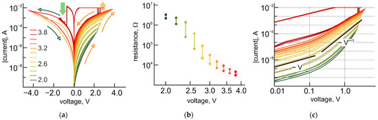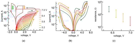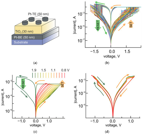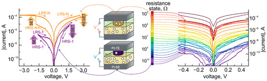Indeed, the experimental I-V curves provide evidence of memristive behavior starting from the values of the applied voltage, which are approximately equal to the standard electrode potentials of reactions, mentioned above. The resistance state of the structures is gradually decreasing with increasing the value of the applied voltage above the standard electrode potentials (Figure 5a). Analog reversible tuning of the resistance is observed within the range of more than three orders of magnitude until the current through the bilayer structure exceeds the level of 10 mA. At this current, the switching to the LRS, associated with the characteristic counterclockwise bipolar switching behavior of the TiO2 layer, happens (Figure 5a).