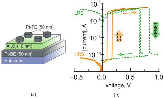 - Alekseeva, L.; Nabatame, T.; Chikyow, T.; Petrov, A. Resistive switching characteristics in memristors with Al2O3/TiO2 and TiO2/Al2O3 bilayer. Jpn. J. Appl. Phys. 2016, 55, 08PB02. [Google Scholar] [CrossRef]