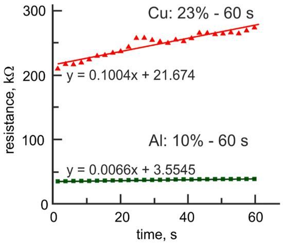 For TiO2/Al2O3 bilayer structures, contributions from the competition of oxygen vacancies and Cu ions to the formation of the conductive filamentary area in the Al2O3 layer are expected to take place. Indeed, if the thickness of the Al2O3 layer does not exceed 5 nm, the gradual resistance tuning is experimentally observed at negative bias applied to the Cu-TE and could be associated with the formation of oxygen vacancy CF. For bilayer structures with larger thicknesses, tuning of the resistance takes place at the positive polarity of applied bias and is related to the formation of Cu ion CF (Figure 6a).