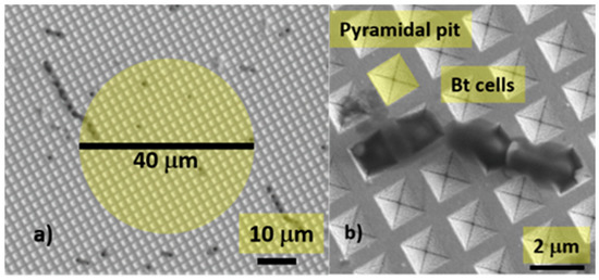 (a) Scanning Electron Microscope (SEM) image of a Bt-contaminated surface-enhanced Raman spectroscopy (SERS) substrate. The yellow circle shows the dimension of the laser spot and, consequently, the scanned area (b) some Bt cells deposited on the substrate, a pyramidal pit is highlighted in yellow.