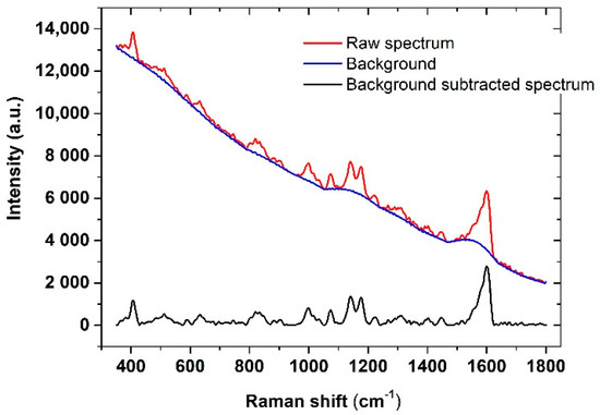 SERS spectrum of the functionalized substrate: Raw spectrum with fluorescence background (red line), fluorescence background (blue line), background-subtracted spectrum (black line).
