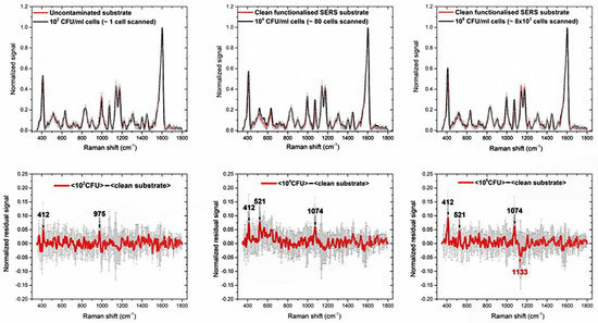 (Top) Mean SERS spectra of the contaminated substrate (black lines) with (from left to right) 102 CFU/mL, 104 CFU/mL, 106 CFU/mL Bt cells. The red spectrum in each graph is the mean SERS spectrum of the functionalized substrate before inoculation with Bt (control, clean substrate). (Bottom) Residual signals obtained by subtracting the spectrum of the contaminated substrates (black lines) from the one of the clean substrate (red lines). The more remarkable spectral differences are labelled in black, if the residual signal is positive or red, if negative. Error bars are reported as grey vertical bars in each graph.