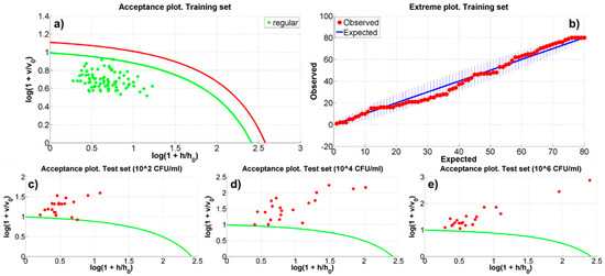 The Data Driven Soft Independent Modeling of Class Analogy (DD-SIMCA) model results relative to the run number 9. Panel (a) shows the acceptance plot for the training set. Panel (b) shows the extreme plot for the training set (the number of observed extreme objects is within the tolerance area, the blue vertical lines). Panel (c–e) illustrate the acceptance plots for the BT-contaminated samples with 102, 104 and 106 CFU/mL. In panels (a,c–e), h and v represents the score and orthogonal distance and h0 and v0 the mean score and orthogonal distance of the training set, respectively.