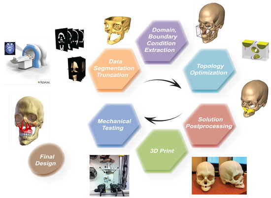 Structural optimization tools, more specifically topology optimization, can be employed to understand the relationship between, geometry, and function of bone and bone-implant by targeting the optimal performance measures. We previously developed a method that uses topology optimization to design bone replacements for craniofacial reconstruction [20], which follows the work flow illustrated in Figure 1. Using this technique, it was shown in [20] that the generic human craniofacial bone structure can be attained when proper load and boundary conditions are utilized in topology optimization. The method was implemented in a variety of clinical cases, which revealed potential in reviving efficient load transfer mechanisms [21]. An experimental validation using digital image correlation on a 3D printed skull based on the topology optimized bone replacement implants was presented in [22].