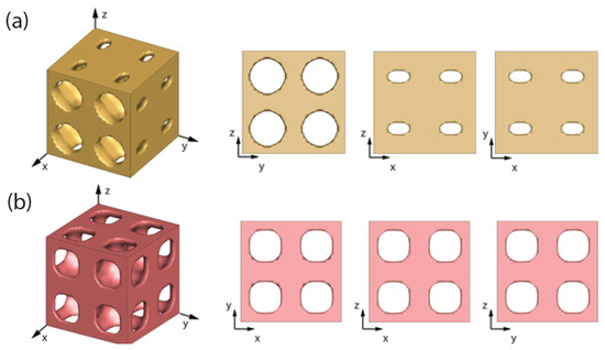 Design of microstructure using topology optimization. Maximization of (a) uniaxial (x) stiffness, and (b) bulk modulus.