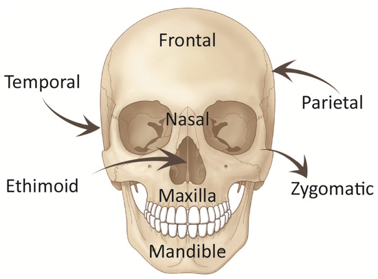 The human facial skeleton has the mandible (jawbone) at the bottom, and ethmoid, vomer, while frontal bone constitute the midline cranium that encases the brain. Figure 3 depicts the anatomy of the facial skeleton. The bones in the midface need to maintain the conspicuous nasal cavity for breathing, hold up the orbit, and transfer the loads from daily human activities (e.g., mastication). Three distinct buttress systems [45,46] exist in the craniofacial structure through which the loads are spread and relieve the stress. Therefore, craniofacial reconstruction should ensure the recovery of these structure pillars after maxillectomy to preserve a strong foundation for basic functional needs.