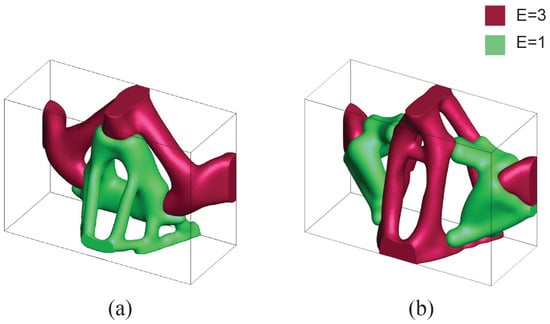 Here, is the elastic modulus for phase i in solid phase (). For a multi-material problem, Equation (3) essentially expresses elastic modulus at a point as sum of all m elastic moduli present at that point. It is important to note that this interpolation scheme may violate Hashin–Shtrikman bounds in cases where is low, and p is high [40]. In the multi-material topology optimization formulation adopted in this work, the problem is divided into several two phase material distribution problems, and they are solved sequentially in each cycle, in a Gauss–Seidel like algorithm [32]. Thus, in each of the subproblems, the two phases ‘a’ and ‘b’ having densities equal to and , respectively, are distributed optimally, while keeping densities of all other phases constant. Mathematically, at each location x,