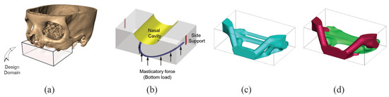 Case 2—Scenario 1: mastication loading is purely vertical. (a) Design domain extraction from patient CT scan, (b) boundary condition used in the analysis, (c) bone replacement shape using single material topology optimization, (d) bone replacement shape with 2 material topology optimization.