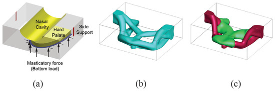 Case 4 requires two different bone replacement shapes for the maxilla and mandible. Both bone replacement shapes need to withstand the loading from daily human activity and to provide a stable mechanism to transfer the load. Two separate design domains are considered to address these structural requirements. The domains are measured to be for the maxilla (top) and for the mandible (bottom) (see Figure 10a). Purely vertical (upward for the top and downward for the bottom) forces are applied to the dentition. Suitable oral cavities are also introduced to not disturb oral activities when implemented in the defect region. Supports are added to ensure secure attachment to the uninjured portion of facial skeleton as shown in Figure 10b. Penalization factor is selected as 3 with 10% for volume fraction constrain (5% each for stiff and soft for multi-material analysis). The minimum length scale remains the same as in previous cases. Bone replacement shapes using single material and multi-material topology optimization are presented in Figure 10.