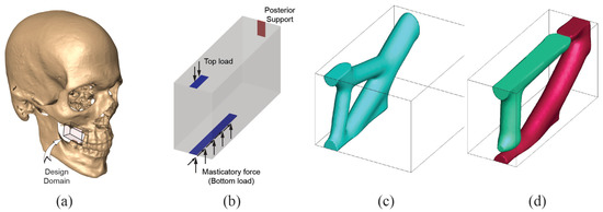 Resulting optimized structures are shown in Figure 9c,d. The horizontal force component in the bottom load led the solution to have a thick and direct connection (member) between their locations to the support at the back surface. From this thick member, the loading from the top surface is linked in a different way for single and multi-material topology optimization. In addition, it is interesting to note that the masticatory forces from the bottom (which is more significant than the top forces due to the higher net force magnitude) have taken stiffer material, whereas softer material is assigned to handle less significant loadings from the top.