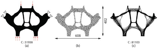 Geometric complexity control using perimeter control constraint [43]. (a) Cross-section of midface across first molar teeth, (b) initial configuration generated by randomly locating circles in the design domain (P = 46,187), (c) topology optimized internal geometry ( = 30,000). A 60% increase in the compliance is observed while achieving 80% volume (weight) reduction.
